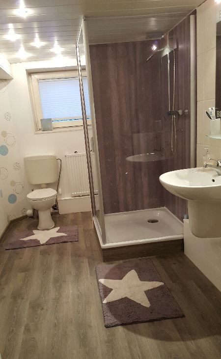 Das Badezimmer im Untergeschoß ist komplett renoviert. Neue, dekorative Dusche mit flacher Duschtasse, Wände frisch gestrichen und tapeziert und ein neuer Fußboden aus Click-Vinyl.